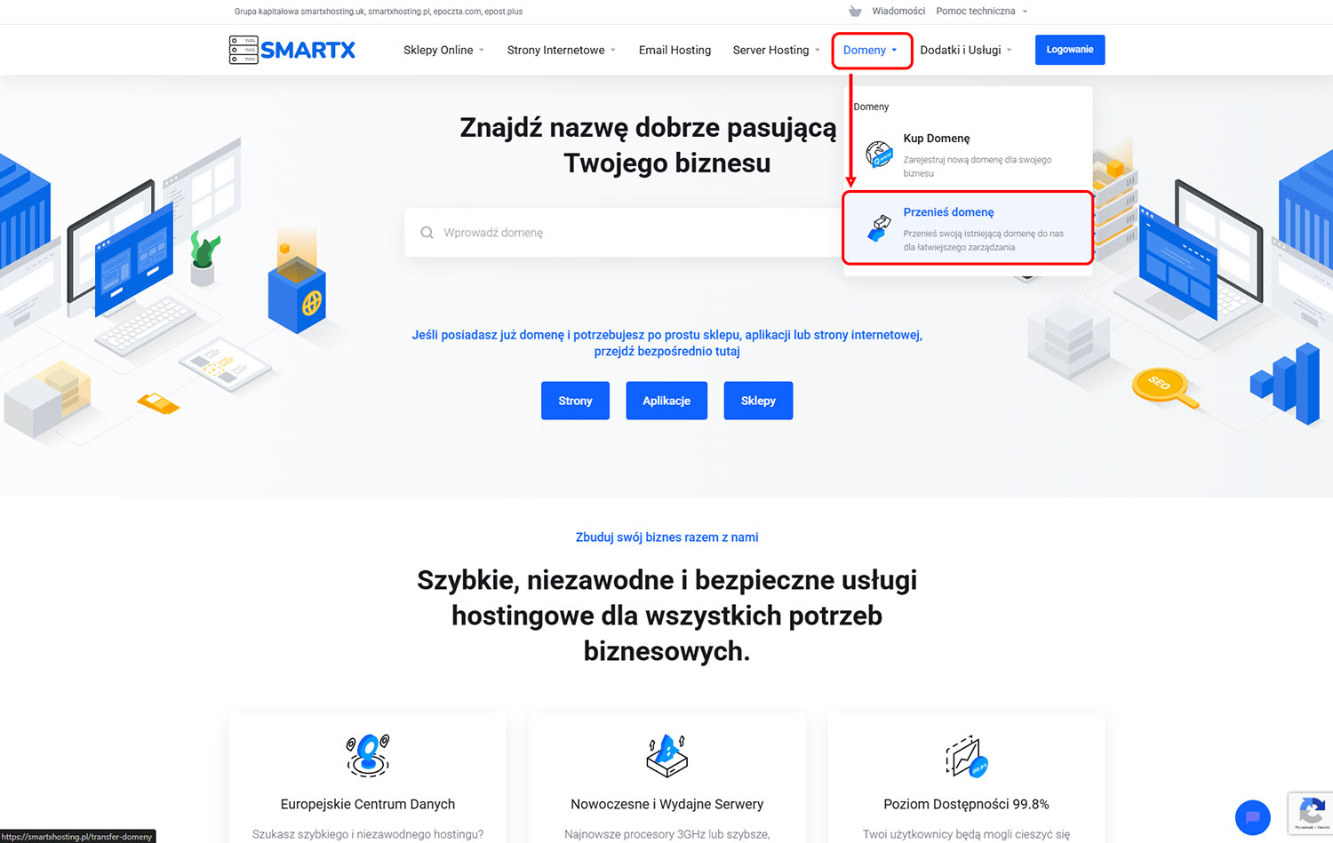 Aby móc w pełni obsługiwać swoją domenę z poziomu panelu klienta smartxhosting.pl, łącznie z ustawieniami DNS oraz jej odnawianiem, konieczne przeniesienie domeny. Aby rozpocząć ten proces wejdź na stronę smartxhosting.pl i z górnego menu wybierz Domeny, a następnie Przenieś domenę.