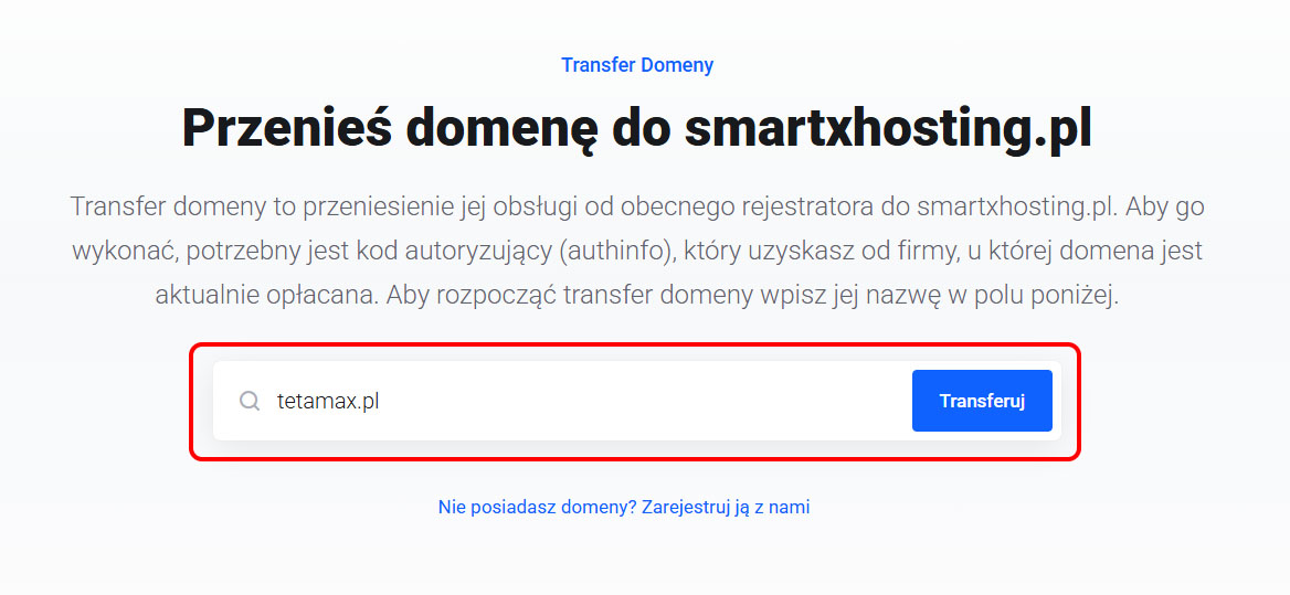 Na stronie Transfer Domeny dostępna jest wyszukiwarka, do której należy wpisać nazwę domeny do przeniesienia, a następnie przycisnąć Transferuj
