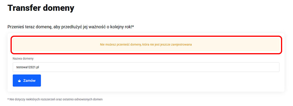 Uwaga! Aby transfer domeny był możliwy musi być ona już zarejestrowana. Jeśli w wyszukiwarce wpiszesz nazwę niezarejestrowanej jeszcze domeny, zobaczysz poniższy komunikat i przeniesienie nie będzie możliwe.