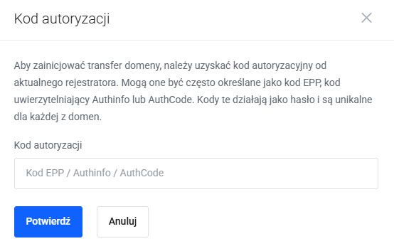 Jeśli w poprzednim kroku wpisałeś nazwę zarejestrowanej już domeny i możliwy jest jej transfer zostaniesz przekierowany na ekran zamówienia i poproszony o podanie kodu autoryzacji (EPP, Authinfo, Authcode). Kod ten zabezpiecza domenę przed nieuprawnionym przeniesieniem i jest niezbędny do rozpoczęcia procesu transferu. Kod autoryzacji możesz uzyskać od obecnego rejestratora domeny.Skontaktuj się z nim i poproś o kod Authinfo dla domeny, którą chcesz przenieść, a następnie wpisz go na ekranie zamówienia na smartxhosting.pl